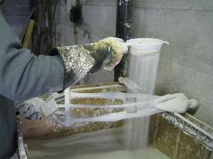 INVESTMENTThe wax is then gated up, whereby solid wax runners or sprues are attached in order to create a feeding system for the bronze. The sprues are brought together at a chosen point above the piece, and attached to a polystyrene cup. If there are no openings in the wax, small patches are cut out at various points. The wax is then dipped in ceramic shell mixture, which has a creamy texture and which covers the surface both outside and inside via the open patches. It also covers the sprues and the cup, creating one continuous surface, or shell. | |